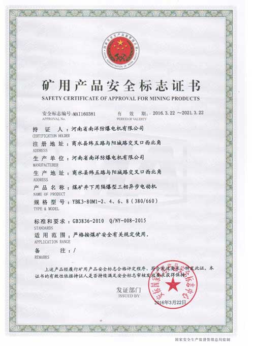 本系列電動機符合 GB755-2008《旋轉電機定額和性能》、企業標準Q/320206JLAB88-2010《YBK3系列煤礦并下用隔爆硯三相異步電動機技術條件(機座號H100-355)》。其防爆性能符合BG3836.1-2010《爆炸性環境第1部分:設備通用要求》和GB3826.2-2010《爆炸性環境第2部分:由隔爆外殼"d"保護的設備》、也符合MT451一l995《煤礦用隔爆型低壓三相異步電動機安全性 能通用技術規范》的規定,制成隔爆科ExdI適用于煤礦井下爆炸性氣體環境的危險場所。也符合IEC79-1,BS4683和EN50018的規定,制成隔爆型。防爆標識為ExdI Mb,使用有爆炸性氣體混合物存在的場所。ExdI Mb適用于煤礦采掘工作面具有甲烷或煤塵的爆炸性混合物存在的工作環境。